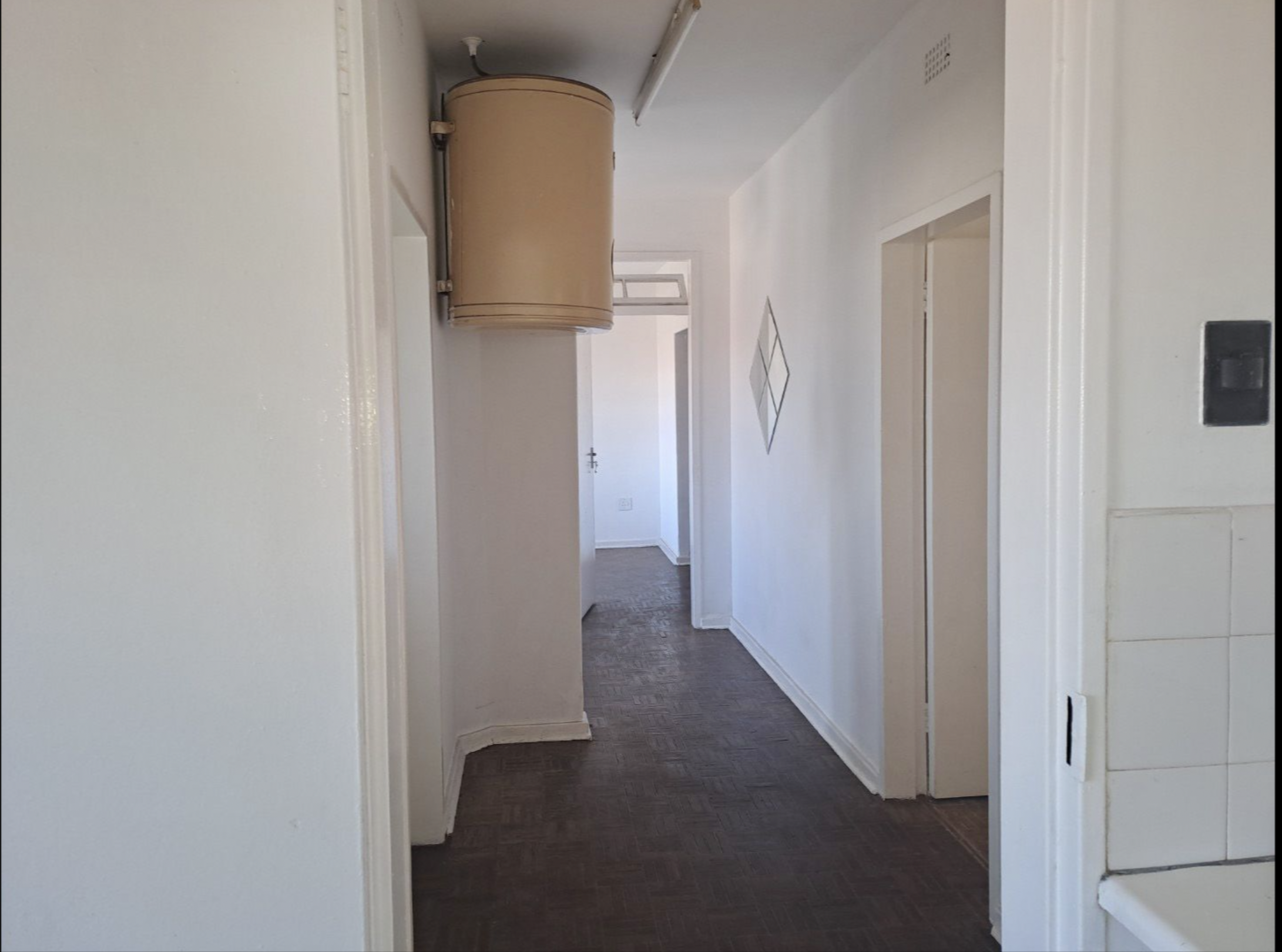 The unit boasts a large lounge, a dining area, a guests’ loo along the wide passage and a bright, neat kitchen with enough cupboards.
